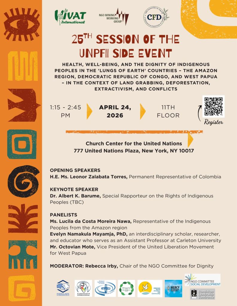 This side event will focus on two aspects: the challenges Indigenous communities in the Amazon region, the DRC, and West Papua face in meeting their needs and rights to health and well-being amid conflicts related to land grabbing, deforestation, and extractive activities. Taking into account the historical roots of the current conflicts in the “Lungs of Earth” regions, this side event will also highlight effective policies and best practices to defend the rights and dignity of Indigenous peoples, especially their rights to health and a clean, healthy, and sustainable environment.